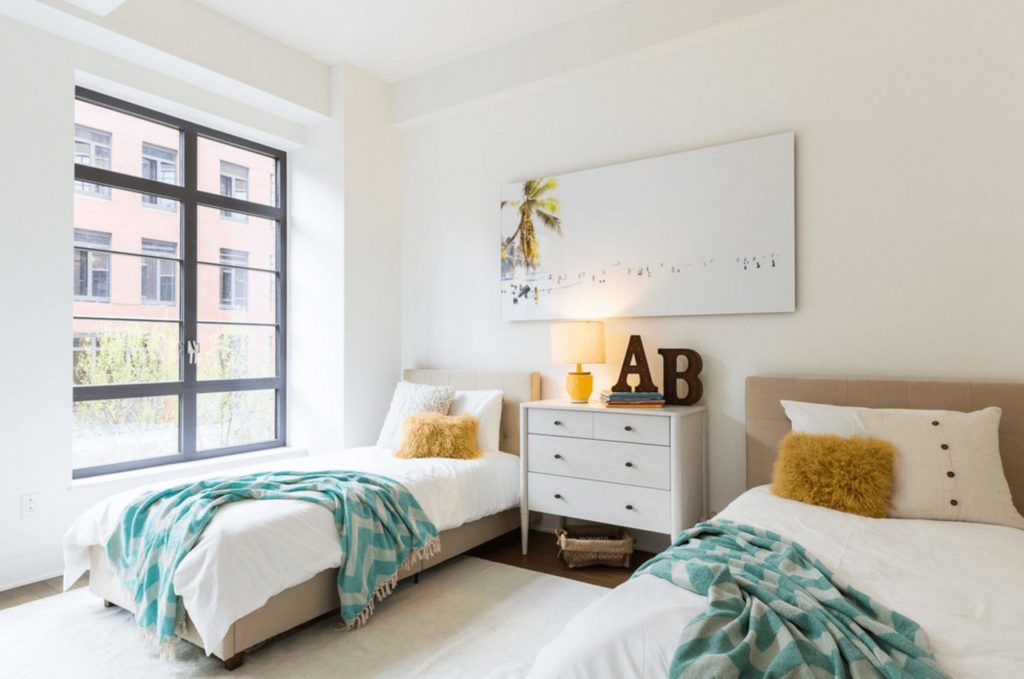 If there’s one example of the power of accent pieces, this is it. Throw blankets and pillows bring out the colors of a tropical print, and the result is a kids room as tranquil as the beach itself.